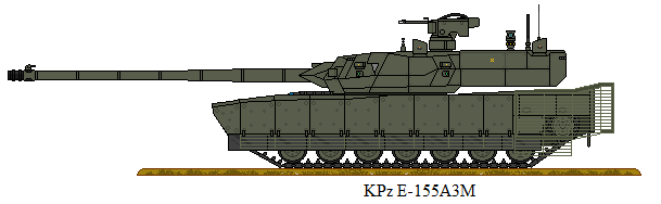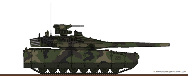 The heavier component of the composite APS system consists of large launcher tubes to the sides of the tank's turret and hull, loaded with quick-reaction countermeasure missiles to intercept both top- and direct-attack missiles as well as railgun shots with enough energy to completely neutralize them. Mounted externally on disposable pods and cold-fired, these beam-riding missiles are guided wither wired or wirelessly by the tank's own radar. Like the armor underneath them, these missiles largely conentrate on defending a fairly narrow arc in the fronts of both hull and turret.