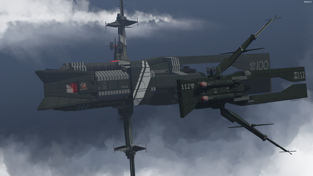 While the ship is largely assumed to risk no attack by any corporate military (as doing so would benefit no corporation), the ship is nevertheless always escorted by two vessels, Khazar and Chaldea - a Forrestal-class aircraft carrier and a Ticonderoga-class cruiser, both modified with compact pressurized water nuclear powerplants; tasked with keeping lesser attackers such as pirates and mercenaries away. Both ships are also owned by the Simeon corporation, giving it the distinction of being one of the few companies that operates aircraft carriers. As part of its defensive complement, the Simeon has an AEGIS suite directing several discrete naval artillery mountings and VLS tubes. The ship also generally holds two or more fast attack craft on its well decks.