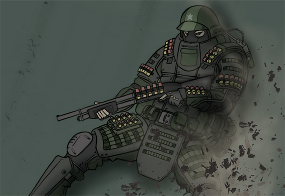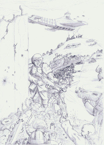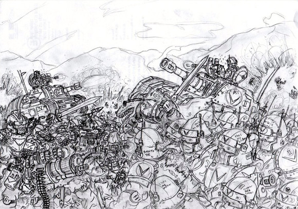 The whole atmosphere and colors of this was inspired by many images from the Imperial Guard from Warhammer 40,000, where you see all these huge masses of soldiers advancing furiously, with explosions and smoke behind them, running atop the piles of their own dead bodies.