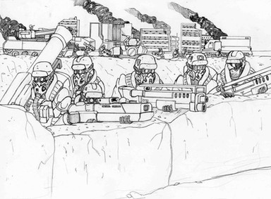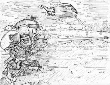 Then after drawing him I sort of got carried along and did all the stuff going around him, particularly the PT-76 [link] light tanks that he's protecting, who are short skinny girls but it was a lightweight tank after all. The airplanes in the background are Su-17s