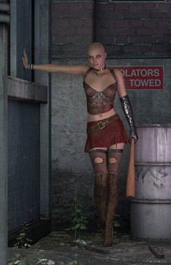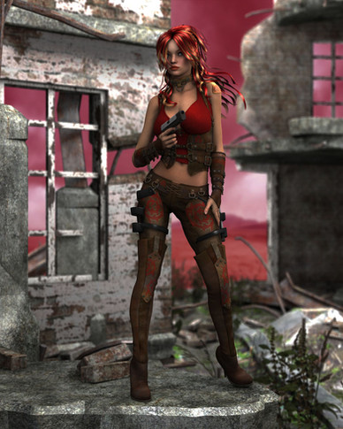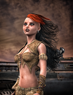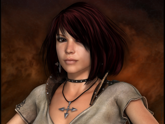 Love this pose, and the background really helps set the tone of the character.Β I've got to ask though, there are some very thin lines running along her left cheek to her upper mouth and chin; are those intentional or a side effect of the lens flare?Β They're only a pixel or so wide and only become visible at full size, but it seems as if someone cut the top of her head off in Photoshop and then reattached it.