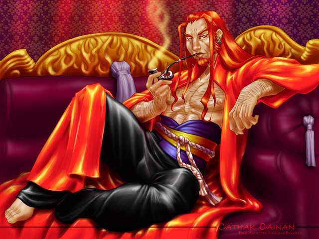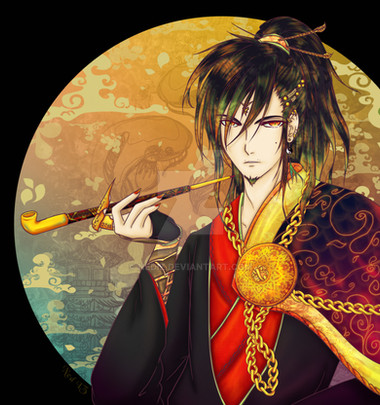 OMG!!! THAT'S SO HOT!!! That big manly chest, with those necklaces dangling off them as though they're teasing you! That thick, luscious, fiery hair (those tresses must have taken forever!) That cocky glint in his eye, and that little smirk! And the finishing touches like the pipe in his hand, that skull on his head and that snake slithering on his other hand. It's all screaming "Heh, I'm a bad boy, can't touch this" (but you know you want to).