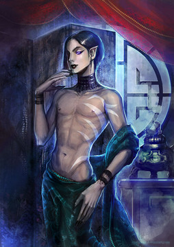 My part of art trade with the absolutely amazingThis is her OC, Kavi, a merchant by day, dark magic wielding shaman by night. He loves exotic creatures, black pearl jewelry, and collecting bones.