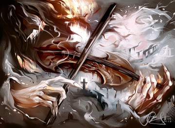 This is amazing. I just love your brush work and art style. Really love how the shapes merge and flow into each other. The violin is so cool! I wish I could play it! Maybe some day ><