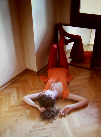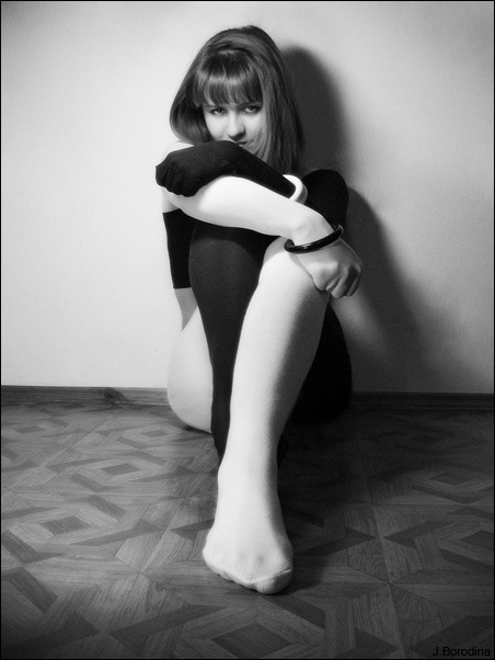 Nasty beautiful girl, it spells. ^^ I really really love the red tights that wrap her fantastic legs, and how she is on the floor grasping her leg and foot (with the other foot pushing the wall). Very sexy, the red tights contrast with the rest of her body. A real angel she is.