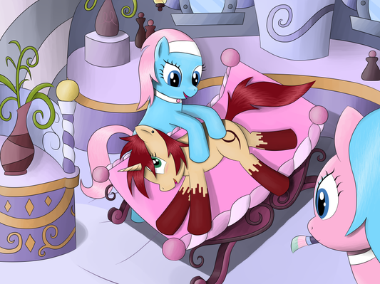 Critique: You forgot the shadow underneath the figure it will look more natural in the setting. Also take a look a anatomy of the back leg of ponies; they do take some practice!