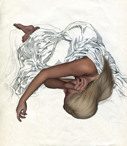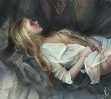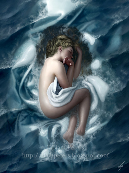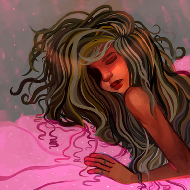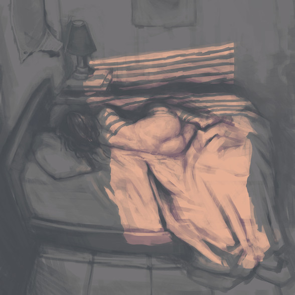 This is such a wonderful painting, your eyes get lost in the lines of the sheets and the tangle of the hair.Β It's surprisingly chaotic for a bedtime scene, which with the addition of the pill bottle (sleeping pills?) and the clock, leads me to believe the person in the painting can't seem to catch a break with falling asleep. The numbers seem to march out of the clock as though the hours just keep going by.Β The detail and shine in the hair as well as the curled up position of the subject are some of my favorite parts