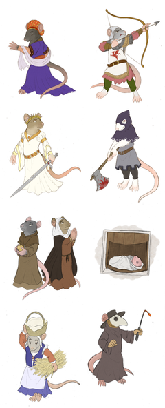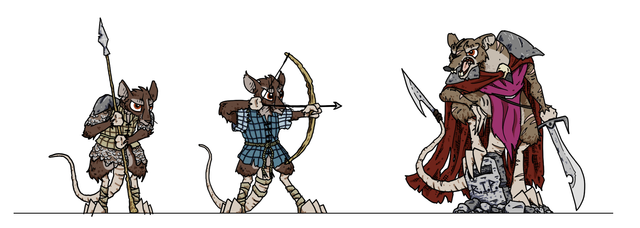 Rats often get a reputation as dirty, conniving, evil creatures in fantasy settings like Redwall or D&D, but in reality rats are cleanly, intelligent, and social creatures. So I figured, why not make some properly advanced medieval rats (at least, advanced by the standards of their setting)?As I've worked on my little series of Medieval Animal paper miniatures, I've begun to develop a setting for them, set in the land of Elhorn. In Elhorn, the Rats are one of the more advanced civilizations, building large cities and developing greater weapons and armor (like crossbows and plate armor) than their neighbors. They're not evil by any means, but they're also not exactly "good" either--they have a very feudal society, which typically places Rats at the top and the smaller, more agrarian Mice at the bottom. However, this feudalism has allowed them to unite a great many cities under one kingdom, making them much more powerful than their neighbors (who're a mix of disparate clans and city-states) and providing security for their citizens and visitors.