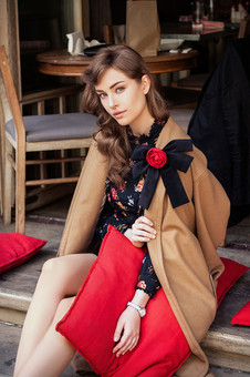 Strong yet vulnerable. On the floor with her arm resting on the chair, her hand on the wood, her coat could be armor, yet the flower so suggestive. Wonderful.