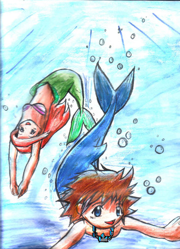 The re-written idea for this is that the Mer-Princes Mokuba and Noah are swimming in their home at sea, when Noah tries to convince Mokuba to go to the surface. Mokuba is hesitant. Seto has warned him about the dangers of humans, but Noah is curious. Since he can't convince Mokuba that way, he decides to exploit his ticklish navel until he gives in. It's a mean trick, but it works! Mokuba and Noah then swim up to the surface. There they spot a beautiful red haired girl walking along the shore. Her blond-haired older brother is with her. (It's Joey and Serenity) They spot the mer-boys, but assume they're human since they're half-submerged in the water. They wave to the boys, and they wave back.