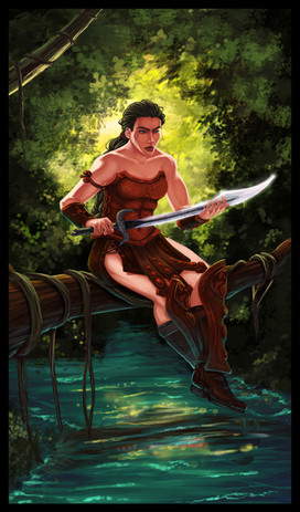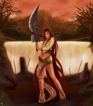 Wow...just....wow. The tree's colors are magnificent, as well as the way the shadows play on her skin and clothing. I like the design of the clothes and the little knives on her thigh.