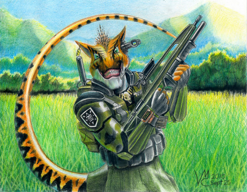 The form, the anatomy and the pose are excellent; those scale/mecha/muscular details are killer as well