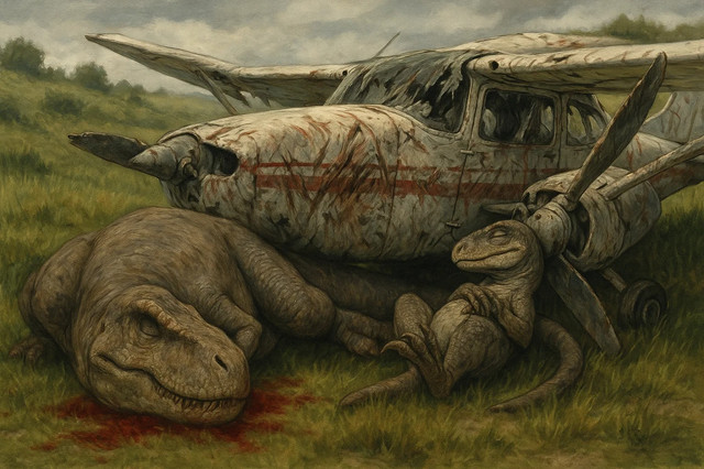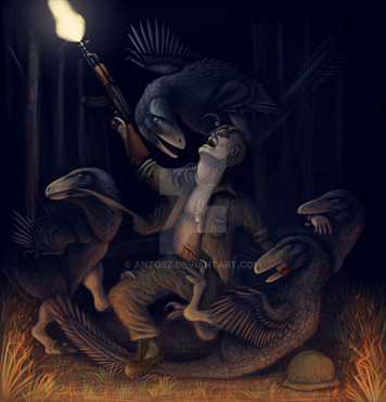 this chopper was in the rescue of an explorer and when it was taking off at ten feet from the ground a raptor jumped into the helicopter scarying everyone in the inside and jumping out, the pilots lost the control and the helicopter crashed from a low altitude...now the raptors are proclaiming victoryRelated content