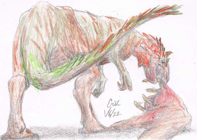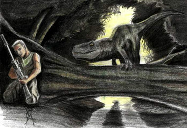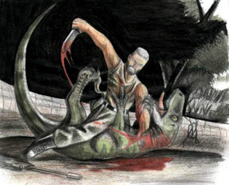 possibly a jp scenne......three raptors attacking a young ceratosaurus and making his last expressionRelated content
