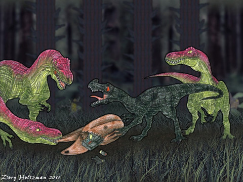 Poor little ceratosaurus... but I like the pic anyway. The Raptors look so cool!