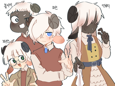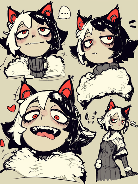 Drawing of Mist, my OC.Based on prompts given by various patreon members. Their names and their corresponding prompts are there as well~