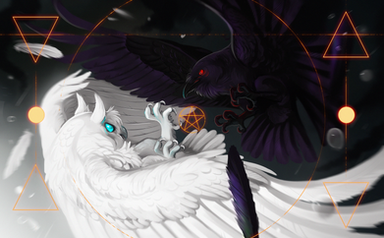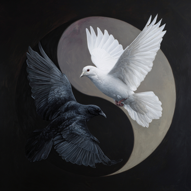 A large white owl overpowers a black raven in this mid-air yin yang inspired battle between birds; representing the struggle for balance and duality.