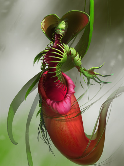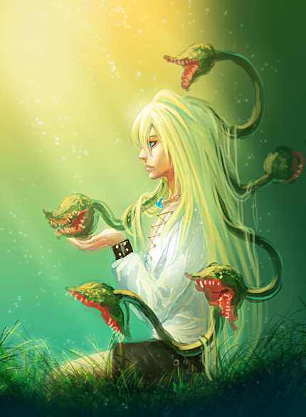 Now on a more happy note, this is BEAUTIFUL! I love the use of pink and green in this! I think you did a really good job of trying to capture the feel of envy in this picture. I also think that it's really cool how you added Venus flytraps and some green flowers into the mix as well. This is definitely earning my fav!