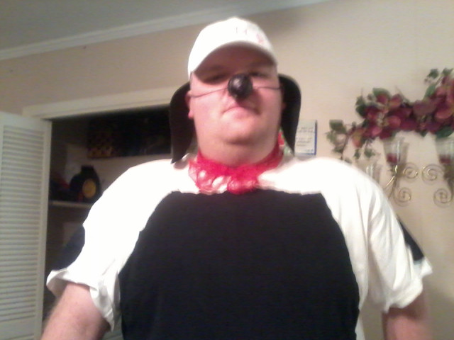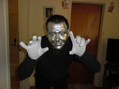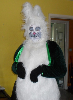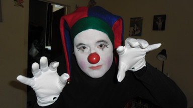 I used dark orange and white Snazaroo Classic Colours for the base (water based). I used a black pencil on my eyebrows, and black lipstick for the nose and lips.
