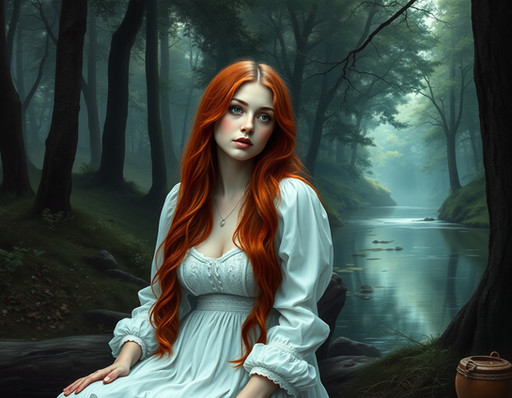 #digitalart #beauty #portrait #redhair #photography #fantasyart #digitalpainting #fantasycharacter #forest #ai #cleavage #dantegabrielrossetti #dress #preraphaelite #redhead #river #romantic #victorian #aiart
