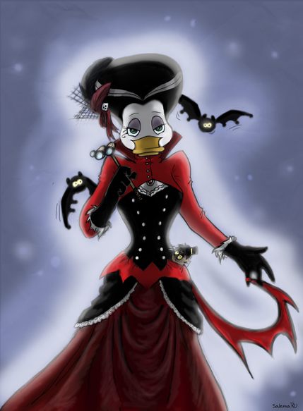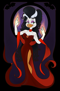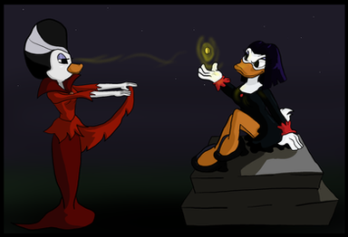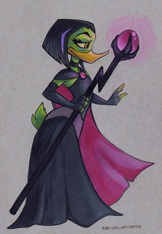 Morgana first met Darkwing not long after moving to St. Canard and there was an immediate attraction between the two creatures of the night from the start, though they have yet to do anything official together outside of costume. Morgana lends her supernatural powers to the Justice Ducks as their resident expert in the occult, having faced down everything from zombies to evil deities. Recently, she has taken Quiverwing under her wing as an apprentice and begun to teach her how to wield enchanted weaponry and enhance her already formidable skills using enhancement magic.