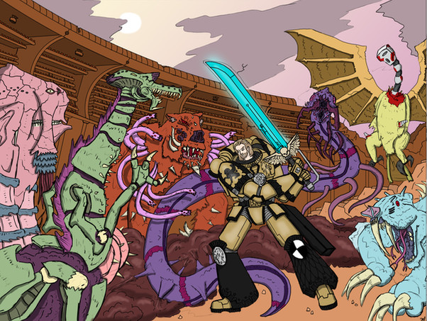 The colouring for this image is rather flat, but the concept more than makes up for that. It's a breath of fresh air - when so many battle scenes in Warhammer 40,000 are bitter, fraught duels or else entire armies clashing in cacophonous calamity, having something with a relaxed, classically action-adventure vibe such as this is a great source of relief and variety. I did say that the colouring was flat earlier, but on reflection this actually benefits the picture: the 'cartoony' cel-shading reinforcing its playful nature.