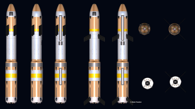 She was available as basic Pégase 10, Pégase 12L and 14L with two or four solid boosters, and Pégase 12P and 14P, with two or four liquid boosters. For interplanetary payloads and high mass geostationary satellites up to 4800 kg the Pégase 12HL, 14HL 12HP and 14HP were equipped with an additional third stage.
