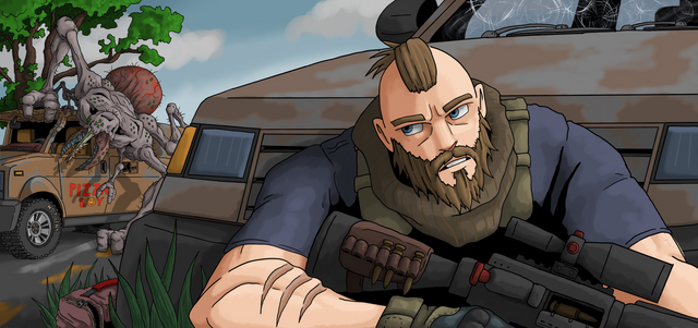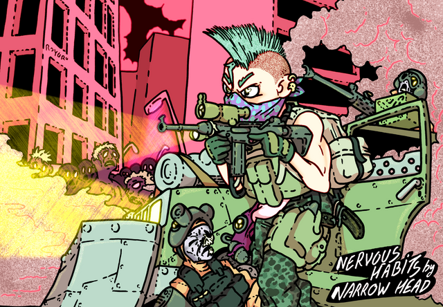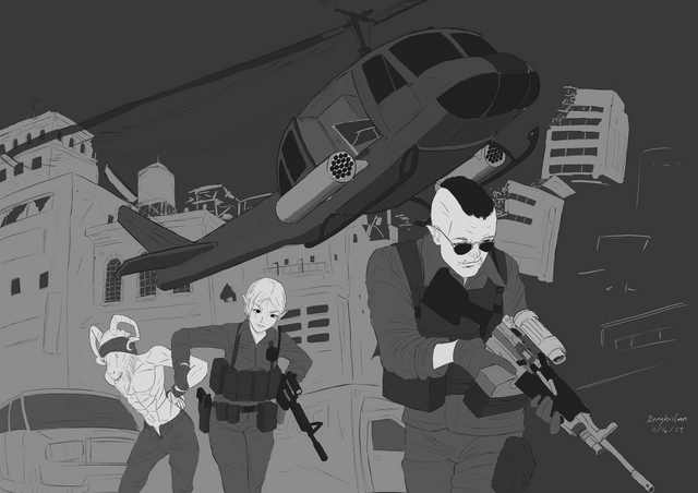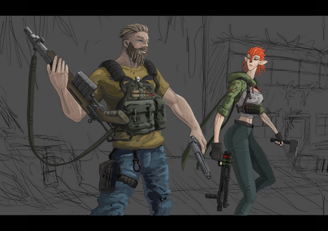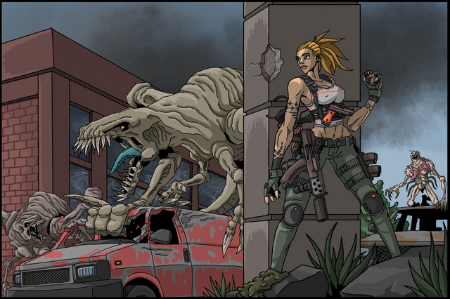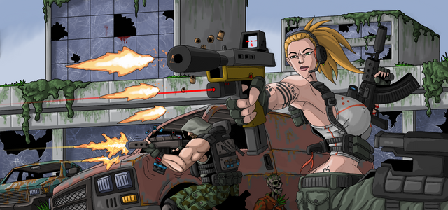 Inked lines and first color and guns muzzle flash color test. Still to ad Over grown elements on the backround and maby one monster.... maby....Related content