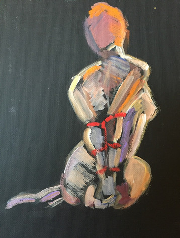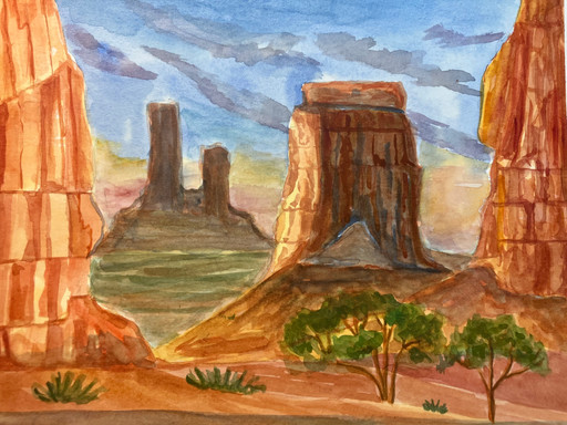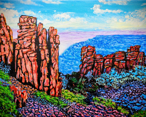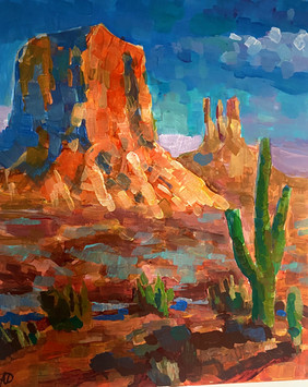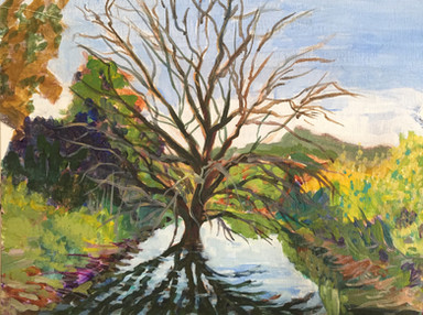 My plein air kit includes: cerulean blue, ultramarine blue, orange (cadmium med), hansa yellow, cadmium yellow, paynes gray, cadmium red, quinicridone magenta, white, burnt sienna and burnt umber. Also I think i used teal and yellow ochre in this one. All acrylics. For the darkest shadows i sometimes use payne's gray and burnt sienna. And then I smear them around a bit I'm no technician. I have started using the slow dry additive and I like it. It gives you more options to swirl colors that would normally dry almost immediately during a pleinair session. Hope that answers your question.