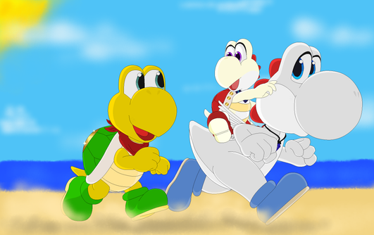 Point Commission forHere are his characters from left to right (Dray, Xenon and Aron) riding Yoshis in Yoshi's Island!
