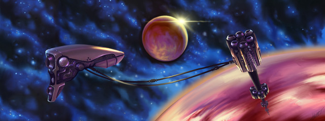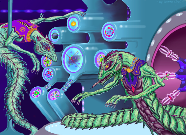 An Iskandelthan Research Vessel. Iskandelthan Starships are somewhat frowned upon by the Intergalactic Community because of the weapon potential of its external Tachyonic Interphasic Assimilator. While beautiful to look at behind it's shielding, the Tachyon to Antimatter reaction is as bright as a million suns and could vaporize anything composed of normal Matter, even the elements themselves, if a port in it's Interdimensional Sheet Energy shielding is dropped on the reactors shell. Picture the "Big Bang" in a bottle!