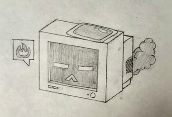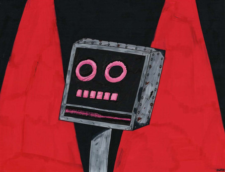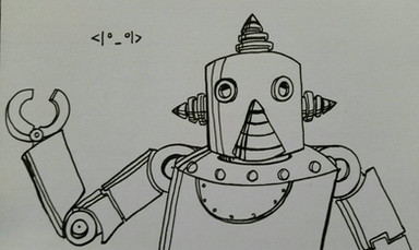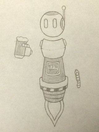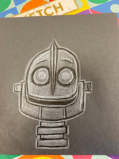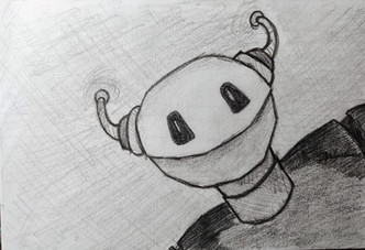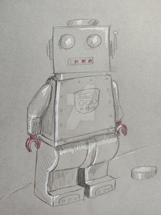 a powerful and rather retro-looking robot, standing in the shadows. tread lightly, you wouldn't want to alert it!i made this using a "reverse drawing" method, where i started with a black background and erased the drawing out of it.