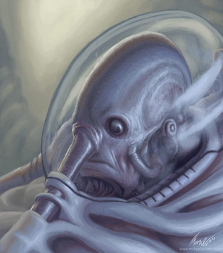 There is so much detail in this. It's really increadible. I like the atmosphere too. It adds for a unique and interesting view. The textures on it are well done, as with the lighting. I think the contrasting white in the background and on the metal suite gives it that much needed and deserved "pop" to the piece.