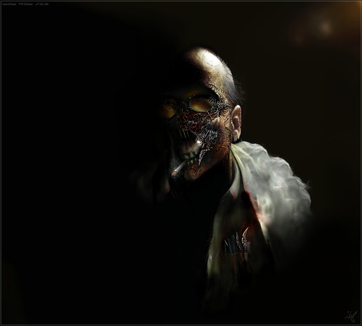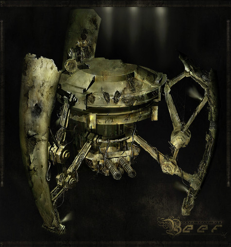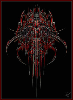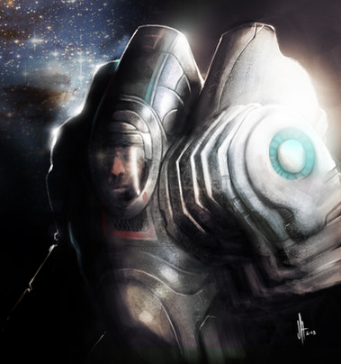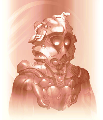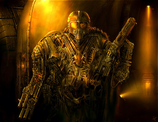 He was made really fast (for me) 'bout 10 hours at 4 times the size here, shrunk down then detailed again. The light and alot of the metal work comes from blend modes of the the brush tool, overlay, soft light, dodge etc.