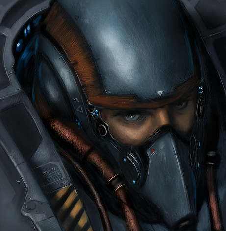 i few lighting issues in the face. the face seems to pop out of the piece when it should be cradled back inside the helmet. i think it's because the right side of the helmet is really dark... give a little more light to that and more detail and it should "fix" this. then again i'm no pro, just offering a suggestion.