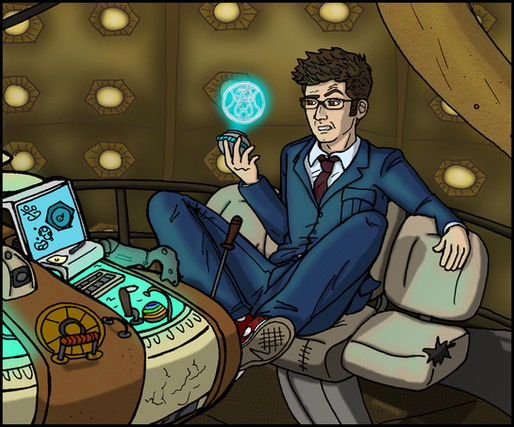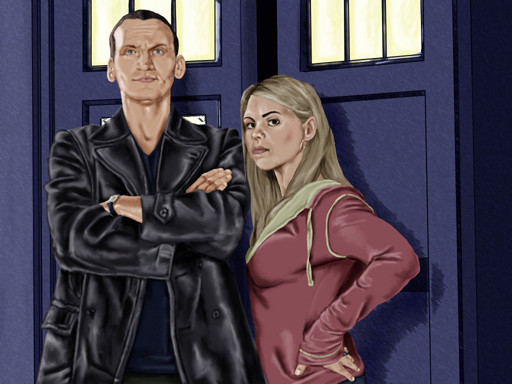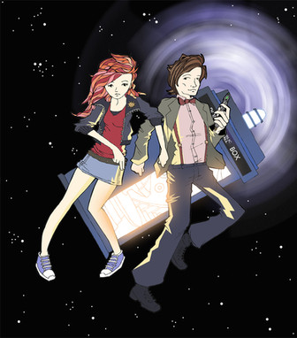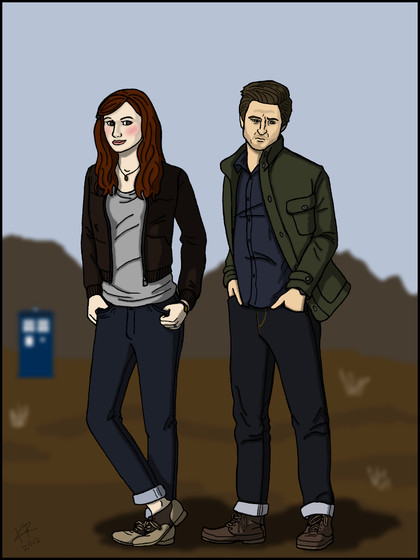 As requested: More Tenth Doctor! He's with Rose this time, as he should be.Technical stuff: hand drawn and inked; color and background digital; background created from a NASA nebula pic and a beach photo I took a couple summers ago.