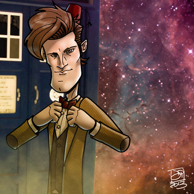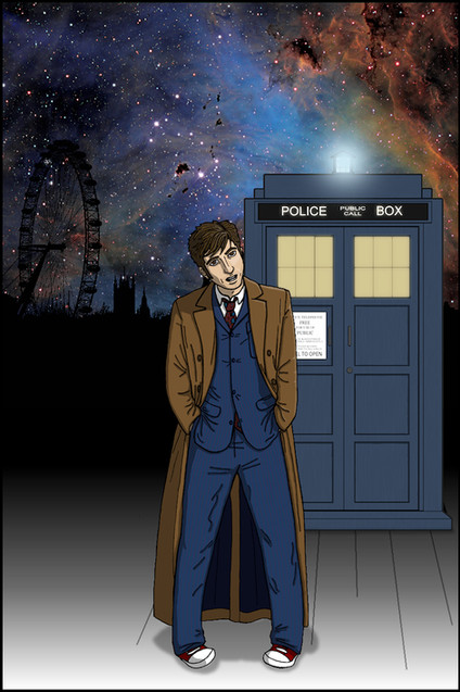 Here it is - the final full digital color project I've been working on over the past several days: Elliott from my comic The Urban Knight doing his best tribute to the Tenth Doctor.Elliott was drawn and inked by hand, the TARDIS and all color done digitally.