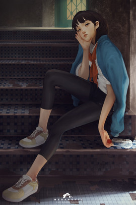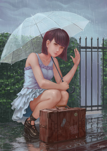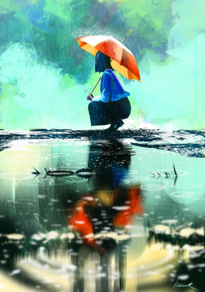 aw i love this one. rain always makes me feel full of energy. The way you draw characters, especially those in glasses, is fun to look at ^^. If i may ask, why is she barefoot?Β