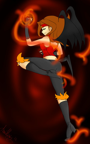 With the Soul of the Hinotama, Connie becomes Pyro Connie, gainning the ability of Pyrokinesis. Along with creating fire at will, she can also control it. Pre-Existing fire will actually heal her.The color of her hair depicts how much power she has to command fire. The brighter red it is, the stronger she becomes. However, her power is just as expendable as a battery's. The more she use her pyrokinesis, the dimmer her hair becomes. If it's black, she is powerless. Water can easily drain her. Heavy winds can, too, but like a regular flame, the right amount of wind can help feed her strength.