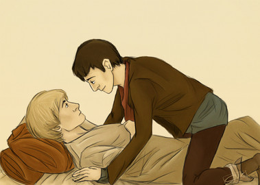 Arthur grabbed onto his hands. "Stop it, you'll ruin it." When Merlin mumbled a quick apology, he softened his expression and leaned back against the cool concrete wall, mimicking the servant boy. "Were you having nightmares?"