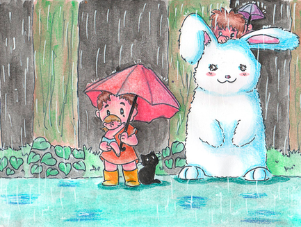 This is lovely! It perfectly captures the feel of a rainy, drizzly day. And your characters are so cute with such sweet expressions. I wouldn't have thought a rainy-day picture could look so happy and upbeat, but this one certainly does.