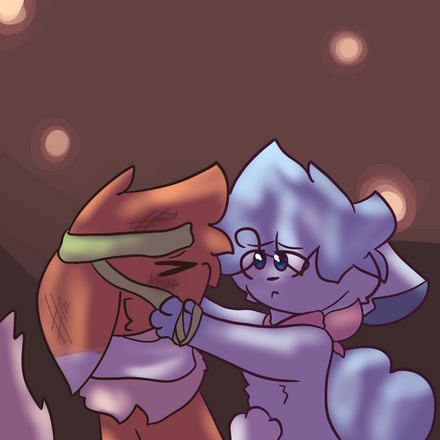 She shot back into consciousness as she held herself being lifted off the ground, coughing up blood as she tried to cry out in pain. “Jesus- I’m sorry.. shit- uh..” She couldn’t see who it was who was carrying her, but she recognized the voice. It was Pickles, her childhood friend. She hadn’t seen him in a while, but his nervous tone of voice made her feel safer. She couldn’t ignore the pain like lightning shooting through every inch of her body though, she just wanted to be free of it. Pickles was gentle not to touch any of her open wounds, trying his best to hold her on her back. He turned to look back at the fight, taking a deep breath and going off to try and find Doctor.F. He walked as fast as he could without accidentally hurting Eva more. “You’re gonna be fine, alright? Everything will be fine.” He muttered, shaking Eva back awake as she was about to drift off again. “I can’t-” She managed to spit out before the pain hit her again like a wave, and she went quiet again. “Jesus Christ, it got you go- nevermind. It’s fine!” He let out a forced wheeze which sounded like some sort of poor attempt to keep the mood light, despite everything.
