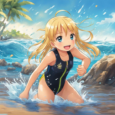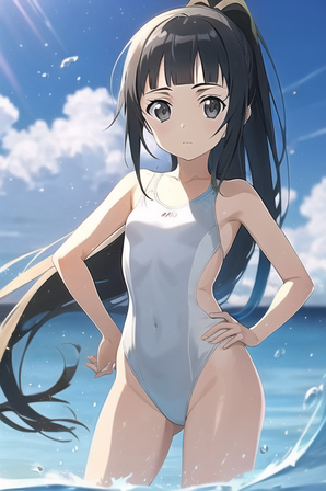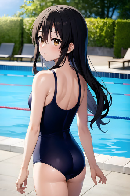 #cloud #day #kneeling #outdoors #sitting #swimmingpool #yui #from_behind #looking_at_viewer #looking_back #swordartonline #competitionswimsuit #ai_artwork