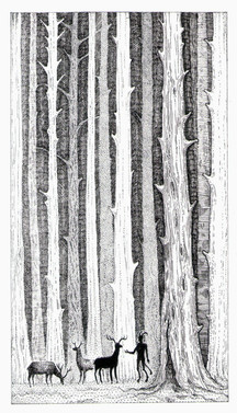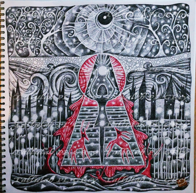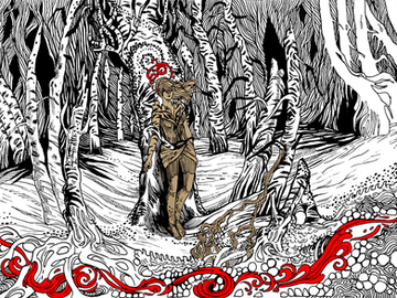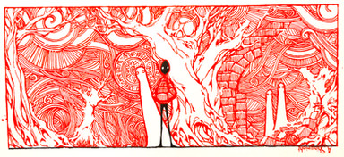 This is a very interesting drawing; I have drawn the woods myself and seen many artists done so as well, but this is the first time I've seen them drawn this way. Great job; I like your unique style and creativity. I also like that you limit the color to just black, white, and red (it really makes the details and various designs pop). Overall, great job