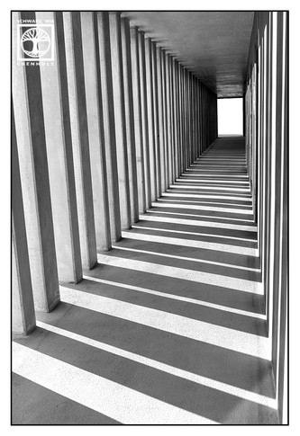 The original photo was overexposed to get the wall in the foreground completely white. Then in post production the image was grayscaled, a separate layer was used to darken up the background, contrast was increased, a cropped and resized duplicate of the image was placed where there used to be door in the far background to create the repetitve effect (twice). Then the image was invereted and duo-toned.
