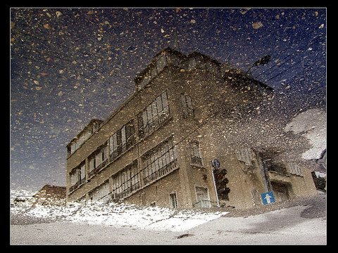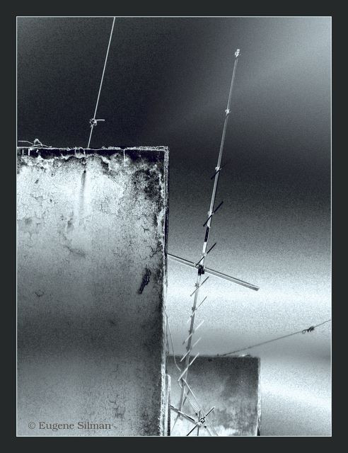 But what really intrigues me is that it feels like in motion and still at the same time. The outside is in motion (I think the feeling comes from the angle/perspective and the cables) and the house - or whatever's inside those walls - is still. The world has stopped there - or at least it's separate from the outside, living at the pace of it's own. Wonderful