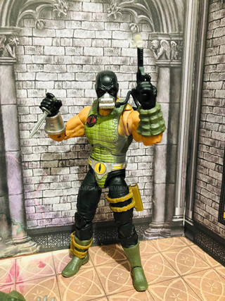 The head is a custom from 'The Casting Cave. The rest of the figure is made from several Marvel Legends figures. Upper torso from a Starlord figure. Arms, hands and jacket from an Old Man Logan and the waist/legs from a Netflix Punisher figure.