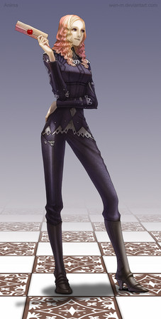 love the anatomy and clothing. I really like the way you've shaded her body and the colours used to do it, i like that you've used the same colours throughout the piece. Holds the design together really tightly, love your stuff.