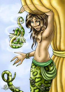 Beautiful picture. She looks like a sorcerous or a small mythical beast charmer. You surly could not dance in that. I like the tatto going with the two drakes.