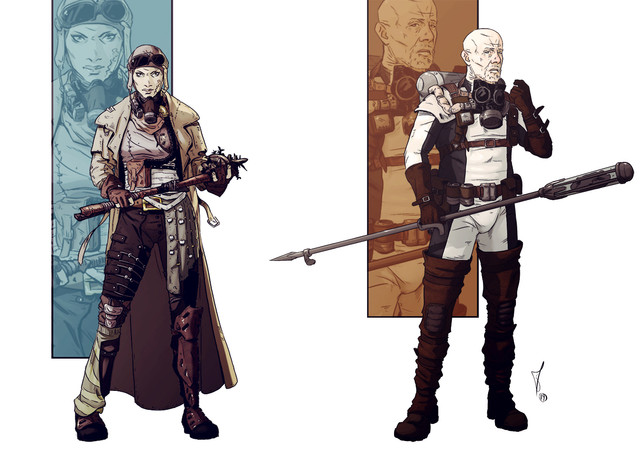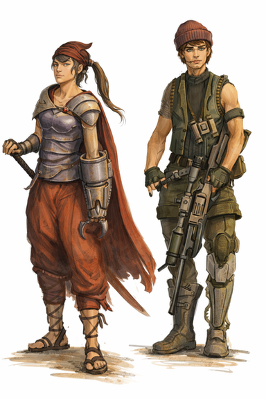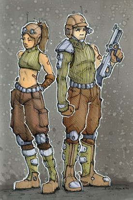 I love them! They look very utilitarian. I love the man's spats and the woman's boots, and I like that the woman is pretty but not scantily-clad, like most rpg women. Great job!